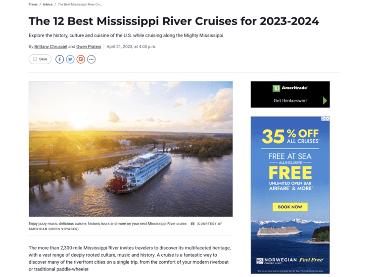 This article on the “12 Best Mississippi River Cruises for 2023-2024” shows a display ad for Norwegian cruises.