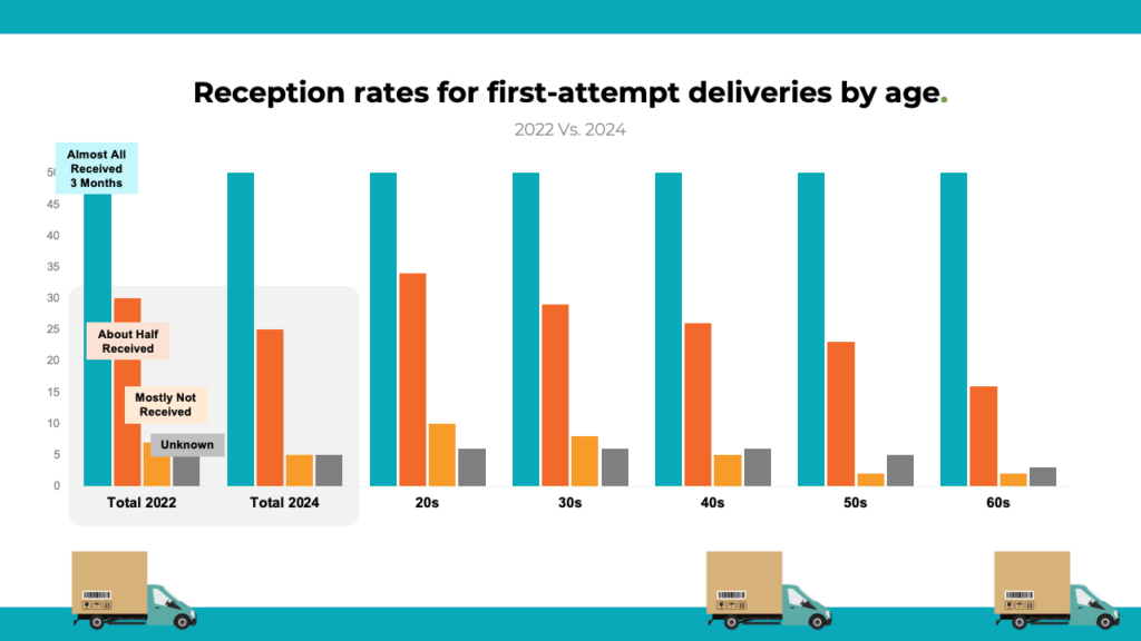 Interestingly, the survey unveiled that first-attempt deliveries achieved an impressive 65% success rate, marking a remarkable 7-point increase from 2022. Success rates were higher among older respondents, with those in their 60s experiencing an impressive 79% rate. Japan’s growing ageing population likely influences this trend, as seniors spend more time at home.